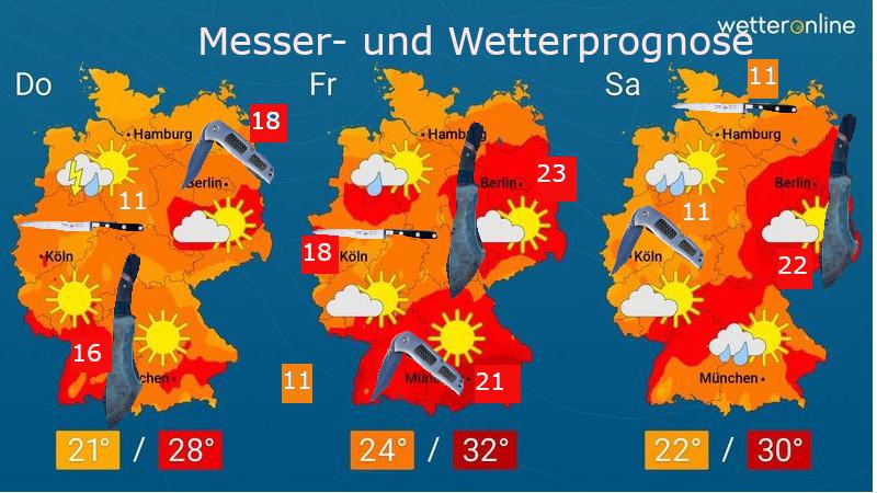 Nicht ganz ernst gemeint: Weil Messerattacken mittlerweile zum Alltag gehören: Warum nicht eine Messerprognose (Anzahl der prognostizierten Messerattacken in den Regionen Deutschlands) mit einer Wetterprognose kombinieren? So kann sich jeder nicht nur auf das zukünftige Wetter, sondern auch auf kommende Messerattacken vorbereiten...